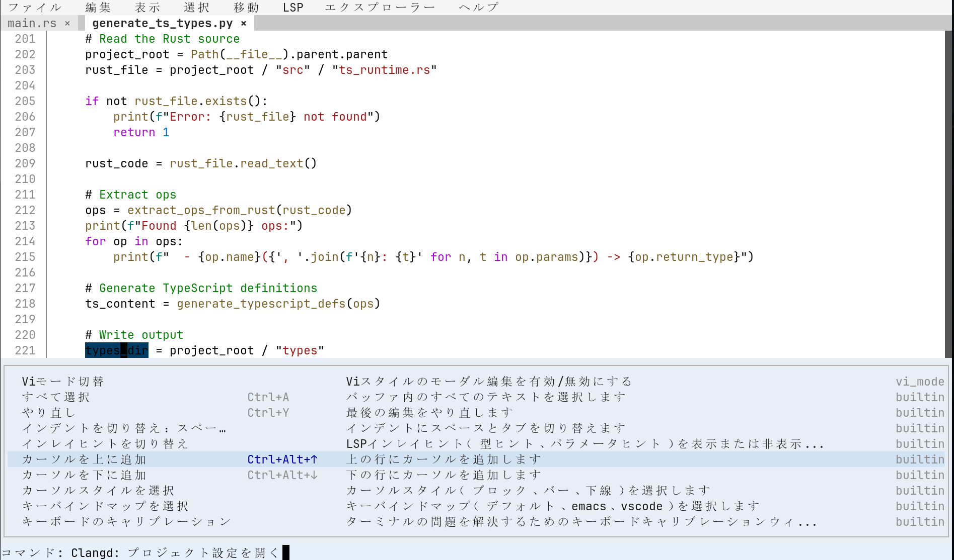 Command palette, menu bar, keyboard macros, diagnostics panel, and copy with syntax highlighting.